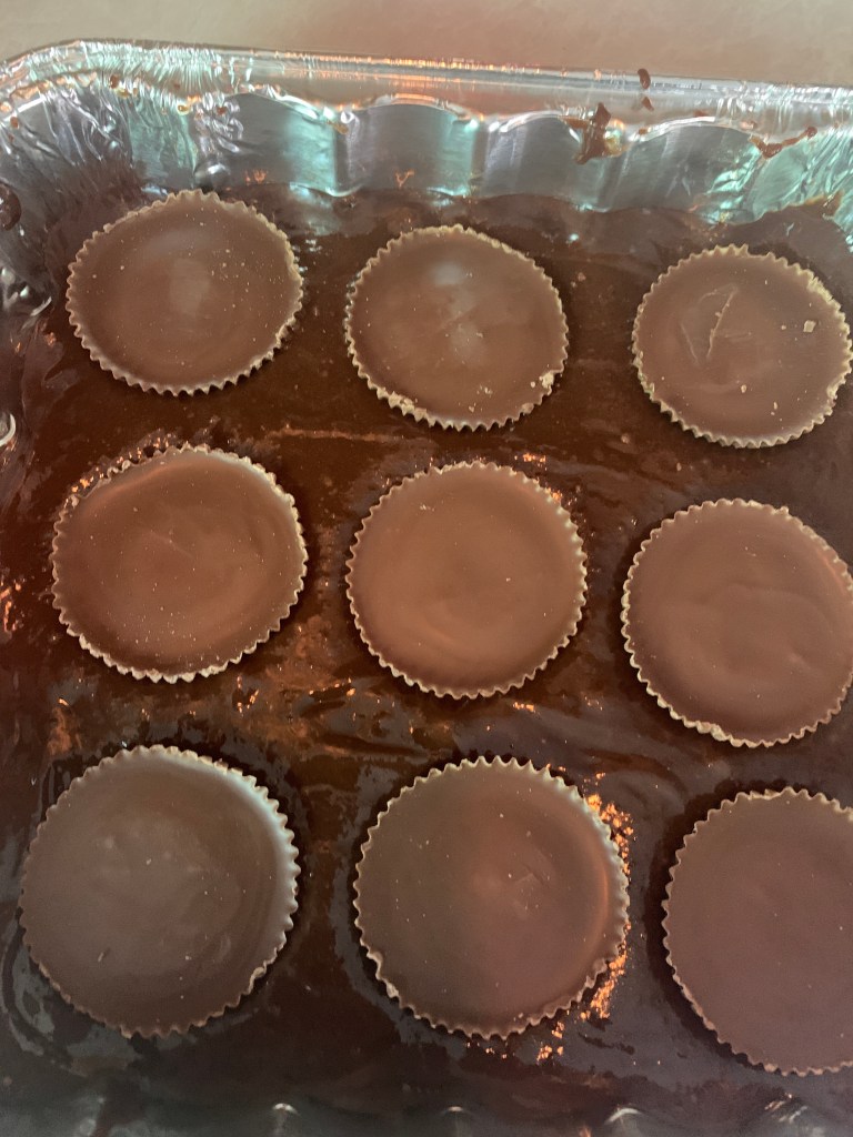 So, this upper picture is a brownie layer, peanut butter cup, brownie and then broken up peanut butter cups on top.