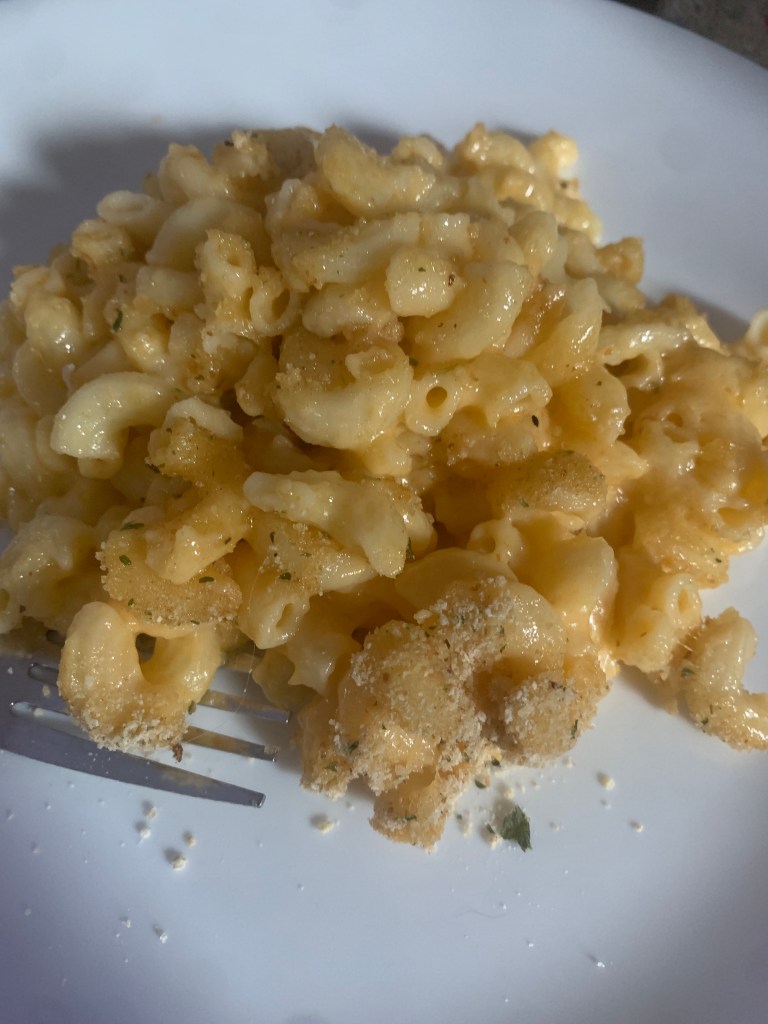 Stir to combine your cheesy goodness in your mac – fully coat every piece of mac. Sprinkle bread crumbs and more parmesan cheese over the top. Place in a 350* oven, for 20 minutes. The top should be golden brown and have a little crisp to it.