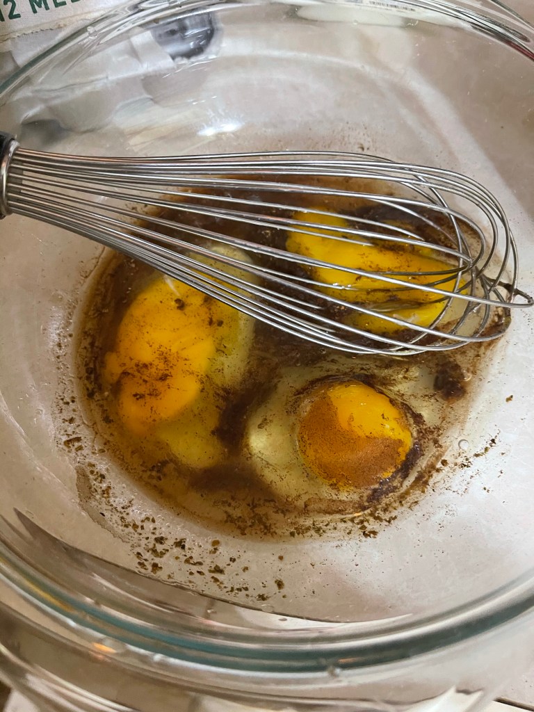 So, that’s what you see here, before I added the milk. So, I made enough batter for 8 slices. But I added a little extra “savory” to it. A teaspoon and a half of decarbed/activated flower. I used a whisk to really incorporate it into the batter.