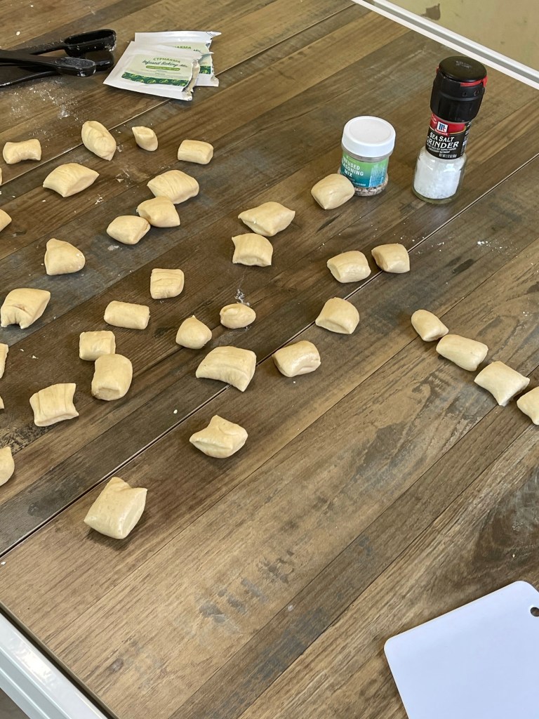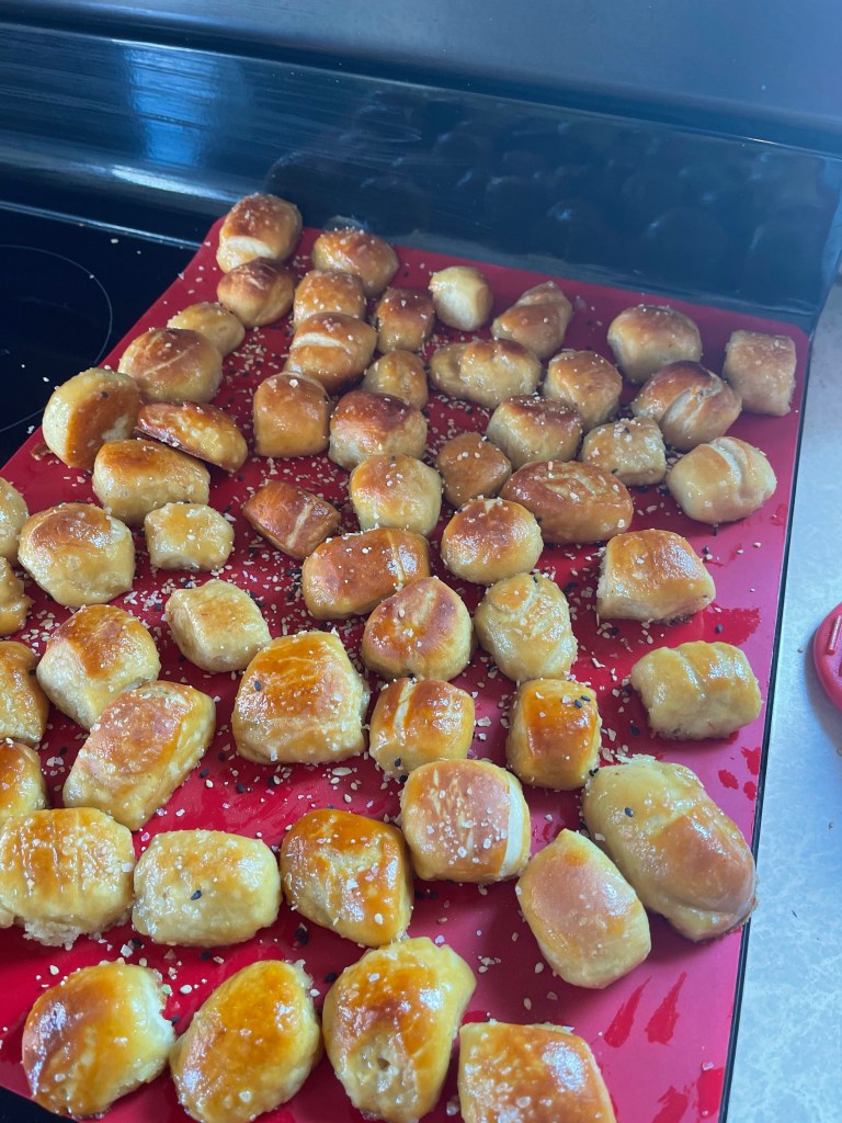 So, the basics are this. We used this recipe https://pin.it/50H7j3T to make our pretzel dough. As I said – we used the CT Pharma baking mix. That’s just added to the dry ingredients of the dough, before any liquid is added. Make sure to whisk all those dry ingredients together to really incorporate that baking mix with the rest of the dry ingredients. Then, continue to make the pretzel bites according to the recipe.