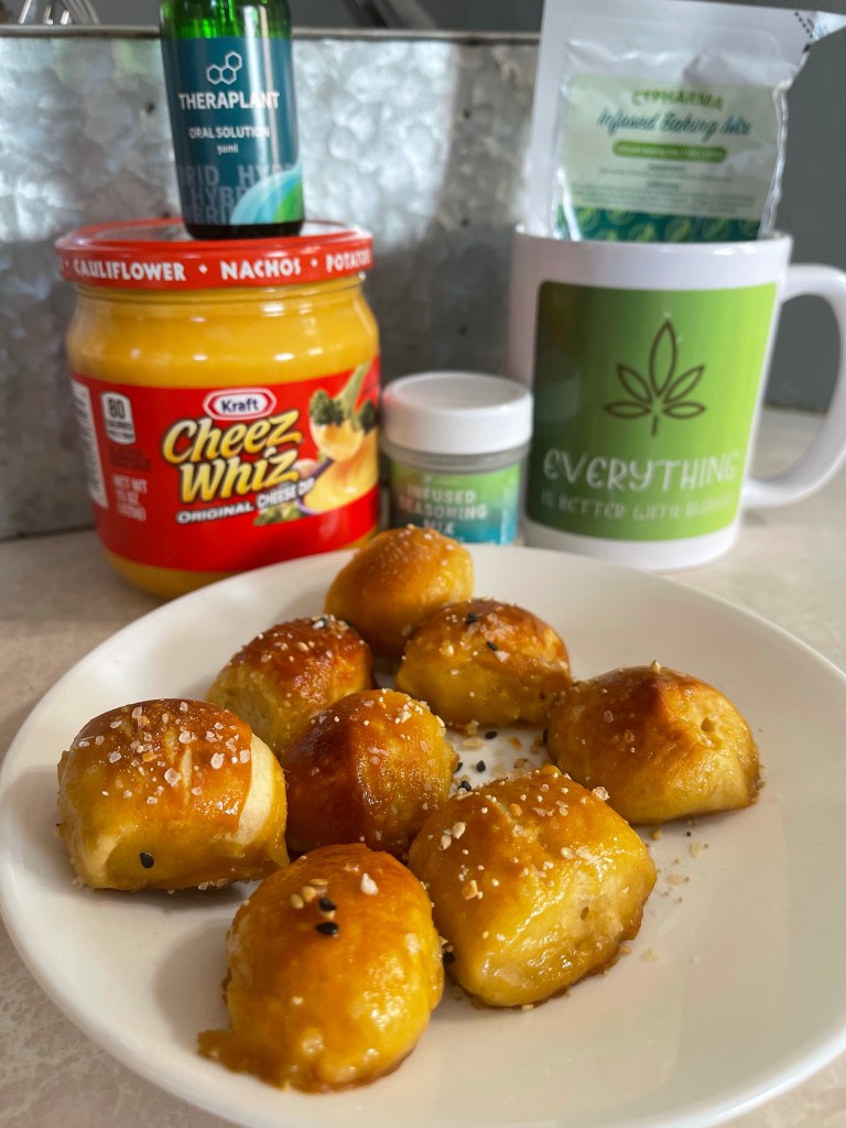 So, this week, let’s just say if you like Auntie Annie’s pretzels, well, you’re in for a real treat today. Because we’re going to make them our way – Auntie Canna’s Pretzels with #ctpharmasol baking mix and their new Everything Bagel but the Bagel infused seasoning. Yes, my friends, cannabis seasoning. But – y’all these little beauties don’t stop there. Because we have also added tincture to the honey mustard sauce and the cheez whiz sauce.