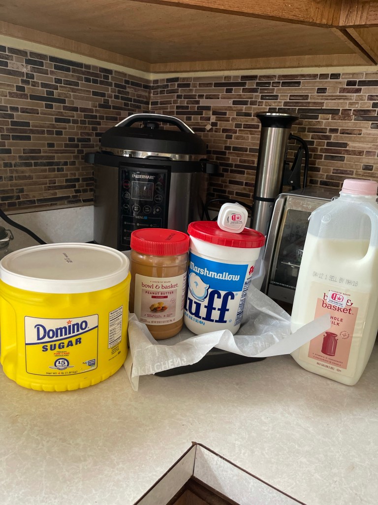 8 Oz of marshmallow fluff. 12 Oz of creamy peanut butter. I used store brand for this. 2 cups of sugar. And a half cup of whole milk.