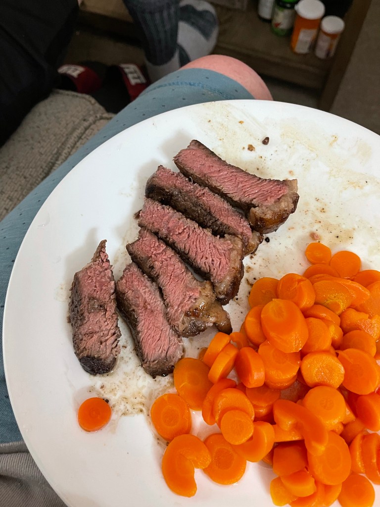 Y’all, it was damn near perfect. Spouse was happy – he likes medium-rare. As I said, my idea of good cow is you walk it by the stove, slap it on its ass, and plate that baby up. But, this was amazing. I can’t even…
