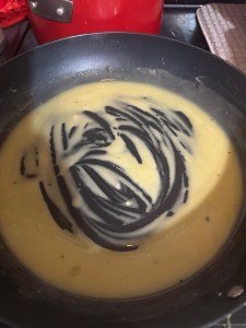 Two tablespoons of cannabudder into a skillet. To that, I added two tablespoons of all purpose flour and made a simple roux.